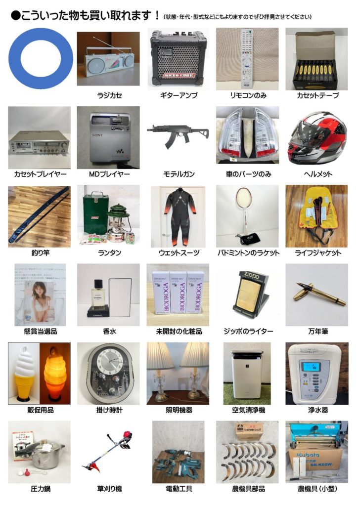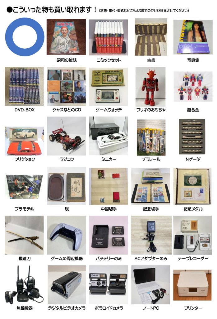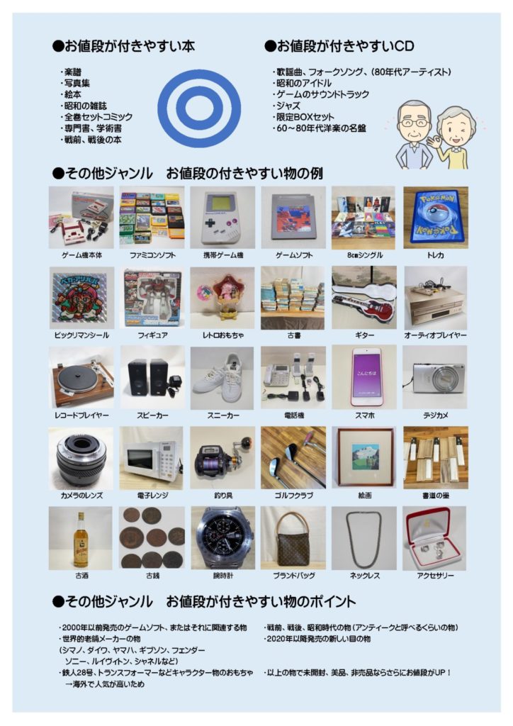 幅広いお品物を取り扱っております。記載していないお品物もお売りいただける場合がございます。また、お売りいただけるジャンルと内容につきましては、あくまで目安となりますのでご不明な点はご相談ください。